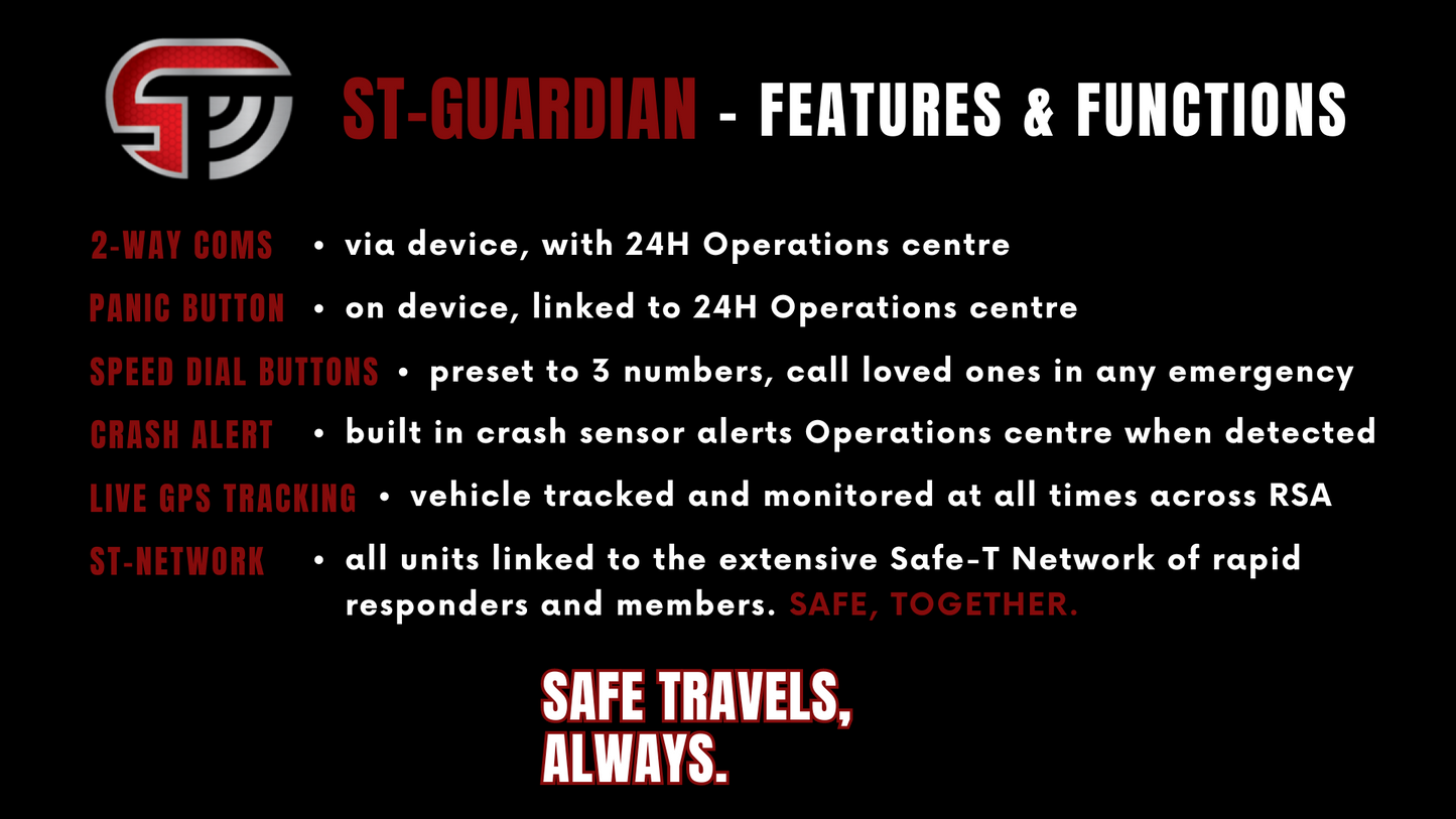 With immediate response capabilities and connectivity to the Safe-T Network, the ST-Guardian ensures that you and your loved ones are safeguarded wherever your journey takes you.